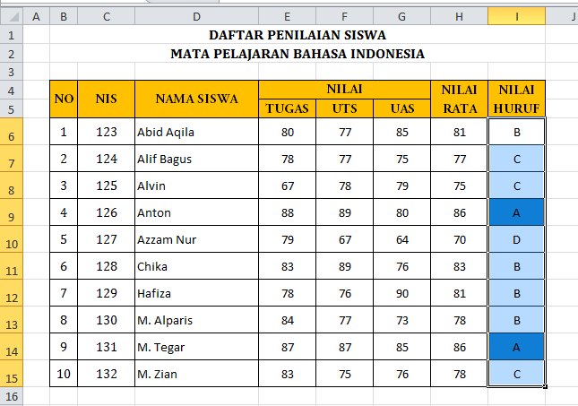 Maka pada lembar kerja Excel pada bagian Nilai Huruf dengan kriteria Huruf A kolom sel-nya akan berganti warna biru.
